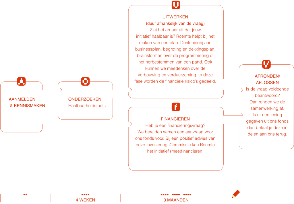 Net als bij een reguliere bank werkt ook Roemte met doorlooptijden. Heb je een gebouw te koop zien staan, en wil je nu een bod uitbrengen? Hou er dan rekening mee dat er ongeveer 3 maanden overheen gaan voordat wij alles in orde hebben gemaakt voor je lening.